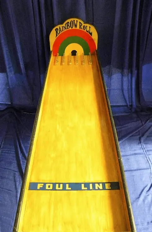 Step right up to Rainbow Roll, a classic tabletop carnival favorite made perfect for events and rentals! Featuring a smooth wooden rolling lane, a bright rainbow backboard, and five scoring slots, this game challenges players to roll the ball just right to hit the highest score—without crossing the FOUL LINE.